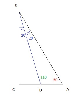 в треугольник ABC с прямым углом C провядяна бисектриса BD найти углы треугольника ABD , если угол CBD равен 20 градусов