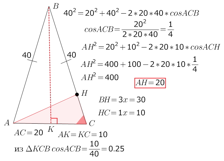 В равнобедренном ∆ABC стороны АВ = ВС = 40 см, АС = 20 см. На стороне ВС лежит точка Н так, что ВН: НС =3:1. Найдите АН.