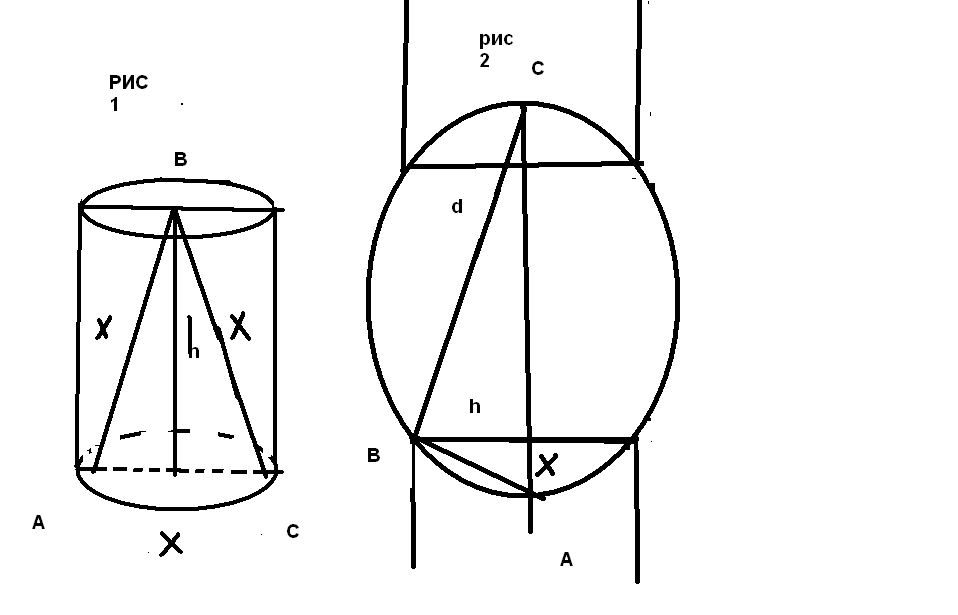 2)На рисунке 2 мы получили треугольник,вписанный в окружность,что является основанием цилиндра.высота h-половина ширины щели d,найти глубину погружения в щель-Х.