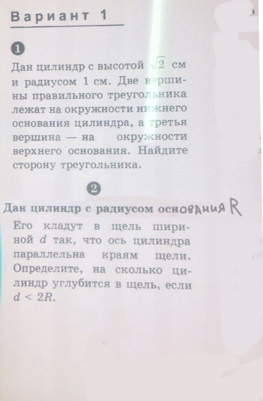 Помогите, пожалуйста, от этого зависит моя оценка за полугодие. 1. Дан цилиндр с высотой корень из двух (2^1/2). Две вершины правильного треугольника лежат на окружности нижнего основания цилиндра, а третья вершина - на окружности верхнего основания. Найдите сторону треугольника. 2. Дан цилиндр с радиусом основания R. Его кладут в щель шириной d так, что ось цилиндра...