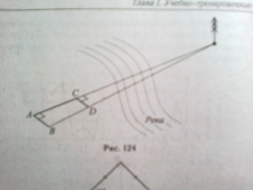 На сколько метров от точки A удалено дерево на другой стороне реки, если AB = 12 м, CD = 10 м и AC = 50 м.