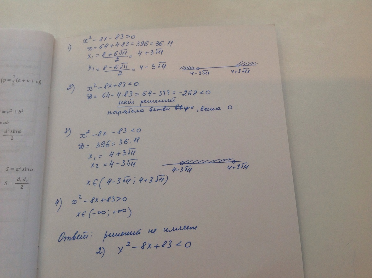 1) x^2 -8x - 83 > 0