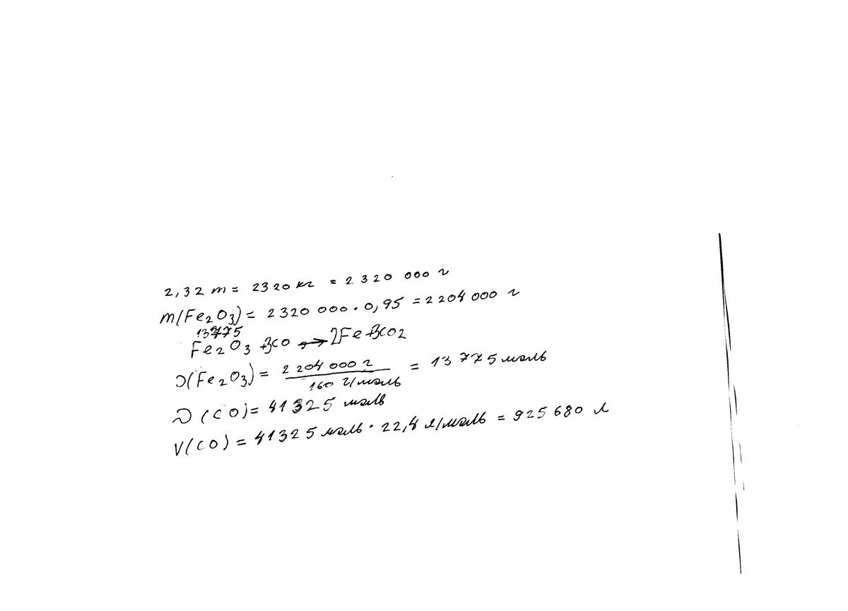 Какой объем CO потребуется для восстановления железа из 2.32 т. Красного железняка, содержащего 5% пустой породы. СРОЧНО!!!!