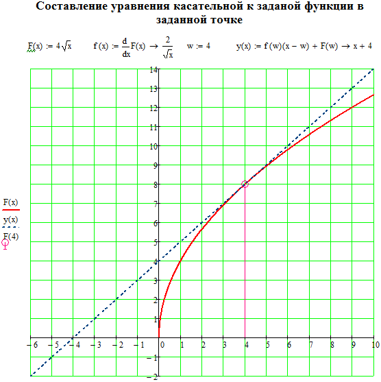 Ясно и понятно! Составьте уравнение касательной к графику функции y=4√x в точке x=4. С рисунком!