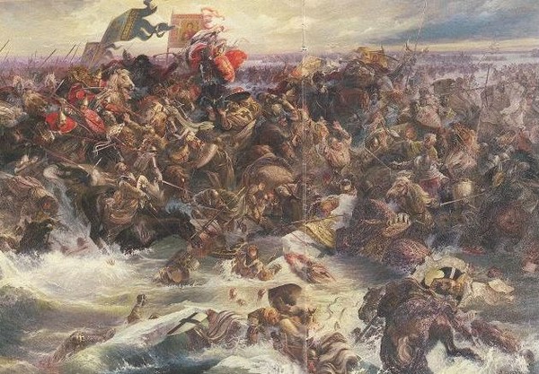 В картине отмечен момент, когда запасной полк князя Александра теснит рыцарей к сиговицам тонкого льда, где сброд со всей Европы – шведы, итальянцы, испанцы и другие, пришедшие к «русскому пирогу», находят свою кончину.