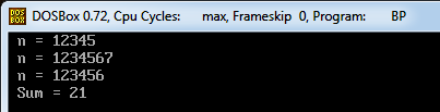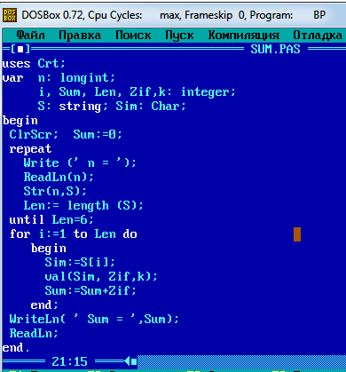 Вводится число с проверкой (в скриншоте представлены случаи, когда число вводилось 5-значное, потом 7-значное, и только при 6-значном числе программа стала проводить вычисленияю
