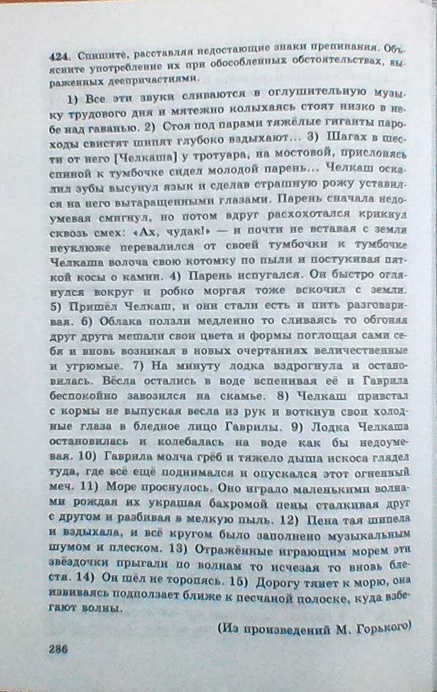 1) Все эти звуки сливаются в оглушительную музыку трудового дня и, мятежно колыхаясь, стоят низко в небе над гаванью. 2) Стоя под парами, тяжелые гиганты-пароходы свистят, шипят, глубоко вздыхают... 3) Шагах в шести от него [Челкаша] у тротуара, на мостовой, прислонясь спиной к тумбочке, сидел молодой парень... Челкаш оскалил зубы, высунул язык и, сделав страшную рожу, уставился на него вытаращенными глазами. Парень сначала недоумевая смигнул, но потом вдруг расхохотался, крикнул сквозь смех: «Ах, чудак!» – и, почти не вставая с земли, неуклюже перевалился от своей тумбочки к тумбочке Челкаша, волоча свою котомку по пыли и постукивая пяткой косы о камни. 4) Парень испугался. Он быстро оглянулся вокруг и, робко моргая, тоже вскочил с земли. 5) Пришёл Челкаш, и они стали есть и пить разговаривая. 6) Облака ползли медленно, то сливаясь, то обгоняя друг друга, мешали свои цвета и формы, поглощая сами себя и вновь возникая в новых очертаниях, величественные и угрюмые. 7) На минуту лодка вздрогнула и остановилась. Весла остались в воде, вспенивая её, и Гаврила беспокойно завозился на скамье. 8) Челкаш привстал с кормы, не выпуская весла из рук и воткнув свои холодные глаза в бледное лицо Гаврилы. 9) Лодка Челкаша остановилась и коле_балась на воде, как бы недоумевая. 10) Гаврила молча греб и, тяжело дыша, искоса глядел туда, где все ещё поднимался и опускался этот огненный меч. 11) Море проснулось. Оно играло маленькими волнами, рождая их, украшая бахромой пены, сталкивая друг с другом и разбивая в мелкую пыль. 12) Пена, тая, шипела и взхдыхала, и все кругом было заполнено музыкальным шумом и плеском. 13) Отраженные играющим морем, эти звёздочки прыгали по волнам, то исчезая, то вновь блестя. 14) Он шёл не торопясь. 15) Дорогу тянет к морю, она, извиваясь, подползет ближе к песчаной полоске, куда взбегают волны.