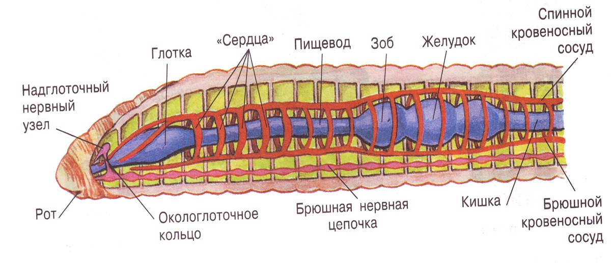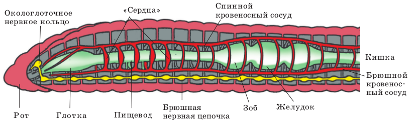 из органов кровеносной системы хорошо выделяется крупные сосуды,заполненный красной кровью, проходящий над кишкой червя. Один проходит над кишкой, а второй - под нею. В начале тела хорошо заметны кольцеообразные сосуды, выполняющие роль сердца.