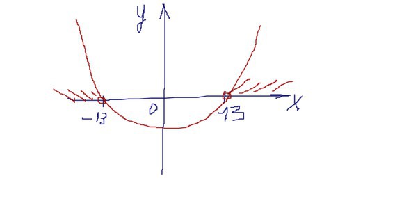 нам нужно больше нуля, значит все, что над чертой, график парабола, ветви вверх, поэтому x ∈ (-∞; -13) + (13; ∞).