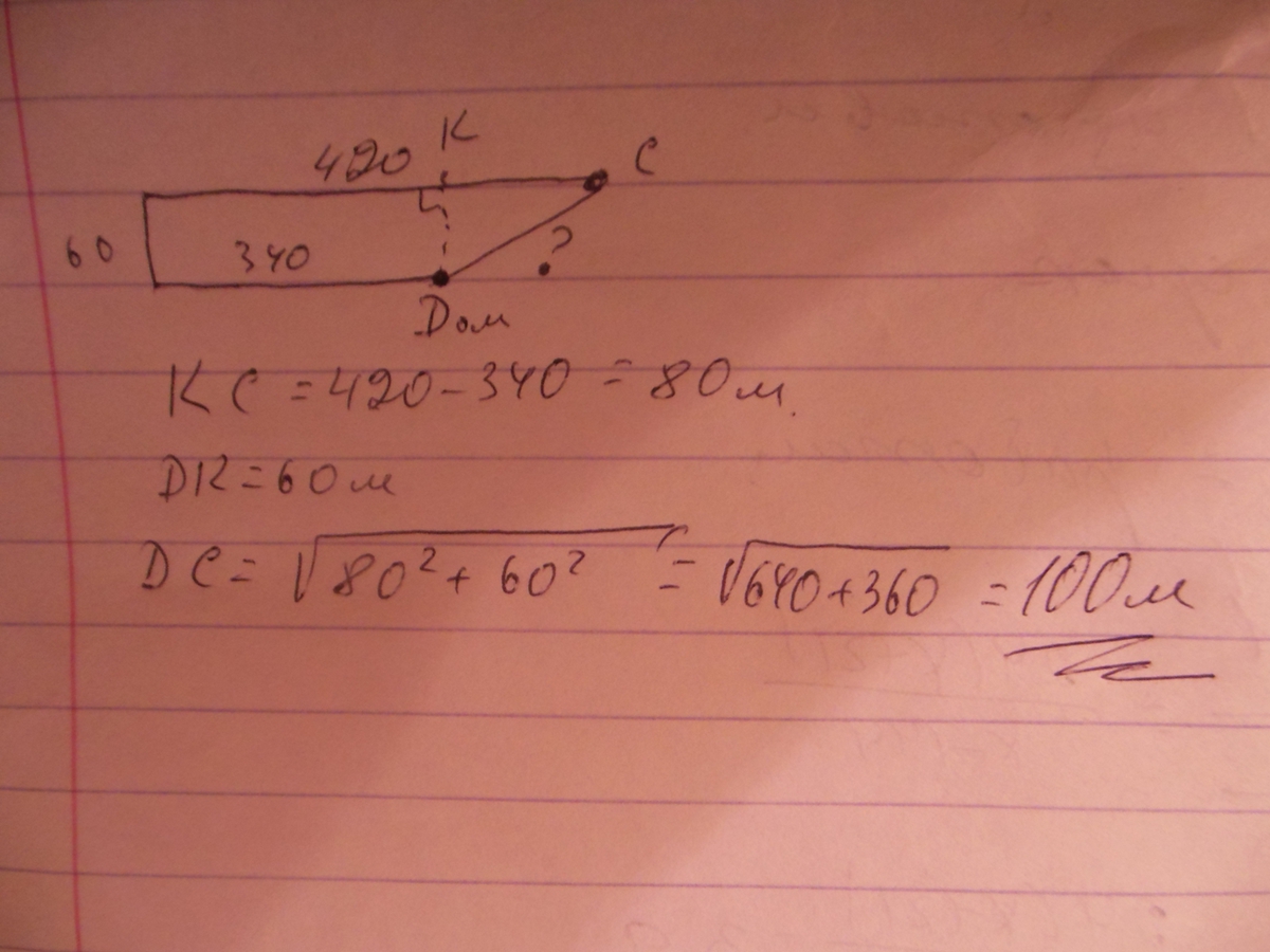 Девочка прошла от дома по направлению на запад 340 м. Затем повернула на север и прошла 60 м. После этого она повернула на восток и прошла ещё 420 м. На каком расстоянии (в метрах) от дома оказалась девочка?