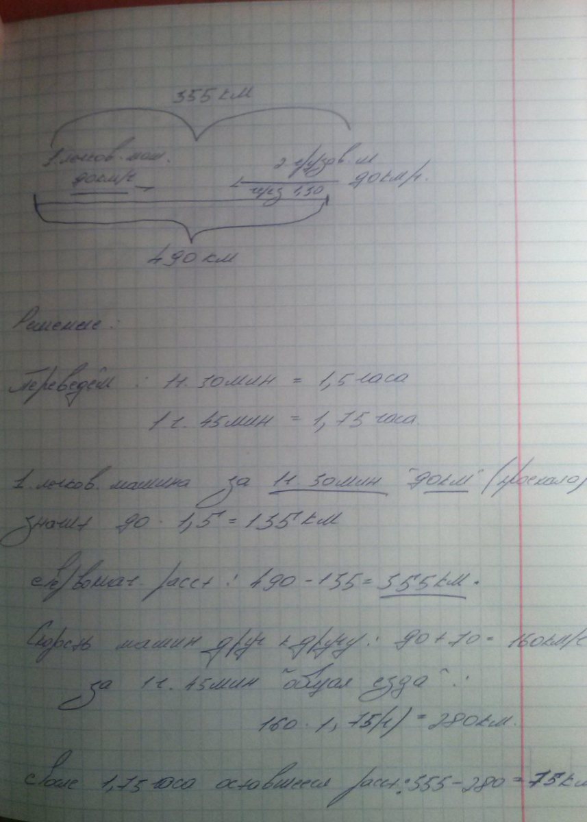 расстояние между двумя городами равно 490 км.Из одногогорода выехала легковая машина со скоростью 90 км.ч .Через 1ч 30 мин из другого города навстречу ей выехала грузовая машина со скоростью70 км.