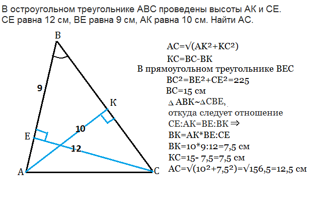 В остроугольном треугольнике АВС проведены высоты АК и СЕ. СЕ равна 12 см, ВЕ равна 9 см, АК равна 10 см. Найти АС.