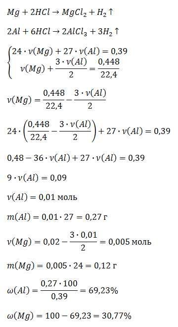 При растворении 0,39 г сплава магния с алюминием в 50 г растворе соляной кислоты с массовой долей 5% выделилось 448 мл газа, измеренного при н.у. массовые доми металлов в сплаве: