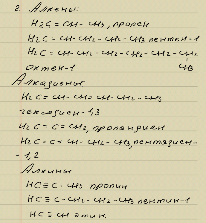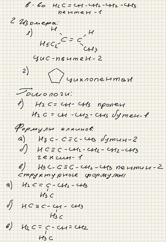 1. а) бутен-1 и бутен-2 ; б) бутадиен-1,3 и бутадиен-1,2 ; в) бутин-1 и бутин-2. 2. Алкены: C3H6 пропен, C5H10 пентен,C8H16 октен. Алкадиены: C6H10 гексадиен,C3H4 пропандиен,C5H8 пентадиен. Структурные в файле. Далее, какие в-ва алкины: C3H4 пропин,C5H8 пентин,С2Н2 этин. Структурные в файле. Далее изомеры и гомологи для пентена-1 в файле. Далее,кто изомеры,а кто гомологи. Гомологи: 1 и 4( пропен и бутен-1),2 и 6( пропин и этин),3 и 5( пропандиен и бутадиен-1,2). Изомеры: 2 и 3( пропин и пропандиен), 4 и 7( бутен-1 и 2-метилпропен). Выберите прав.отв. бутин-2 и бутадиен-1,3 это : все варианты ответав не подходят. Вообще это межклассовые изомеры. Даже сказать,что это изомерия по положению кратной связи нельзя,так как у алкадиенов наличествует сопряженная система делокализованных пи-электронов. Нет правильно ответа. Составьте формулы алкинов[Файл]. Далее,запишите структурные формулы[файл]. Массовая доля карбона в а) 2-метилбутен-1: w(C)=85,63%, б) 3-метилбутин: w(C)=88,16%, в) 2-метилбутадиен-1,3 w(C)=88,16%.