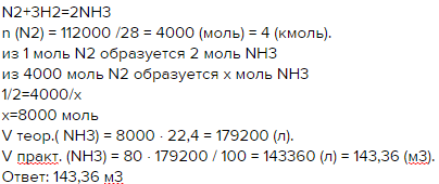 10. Сколько литров аммиака (NH3) образуется при взаимодействии 112 килограмм азота (N2) с водородом (H2)? Выход от теоретически возможного 80% (нормальные условия).