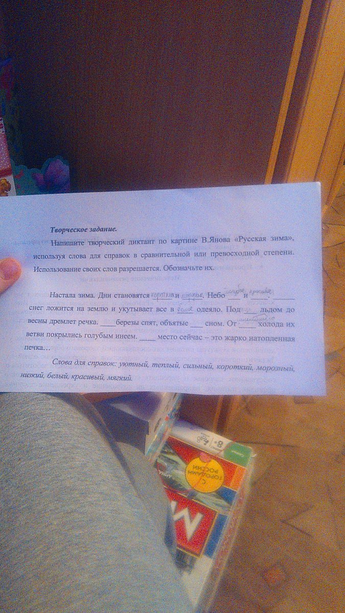 Настала зима. Дни становятся короткими и морозными. Небо белое и красивое. Белый снег ложится на землю и укутывает все в мягкое одеяло.Под морозным льдом до весны дремлет речка. Низкие березы спят,объятые красивым сном.От сильного холода их ветви покрылись голубым инеем. Теплое место сейчас- это жарко натопленная речка.