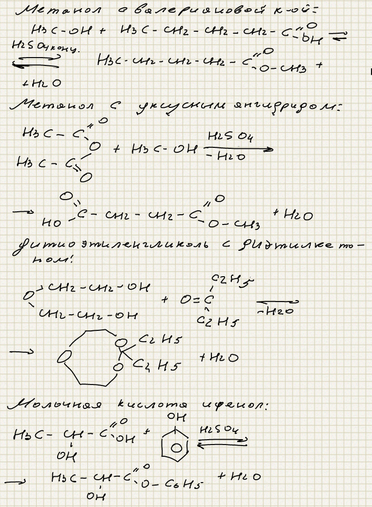 Напишите реакцию взаимодействия метанола с валериановой кислотой, метанола с уксусным ангидридом, анилина с ацетоном, анилина с хлором, диэтилкетона с дитиоэтиленгликолем; реакцию образования сложного эфира молочной кислоты и фенола