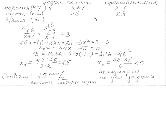 Моторная лодка прошла 28 км против течения реки и 16 км по течению, затратив весь путь 3 ч Какова скорость моторной лодки в стоячей воде, если известно, что скорость течения реки равна 1 км/ч? Дано можно таблицой пожалйста