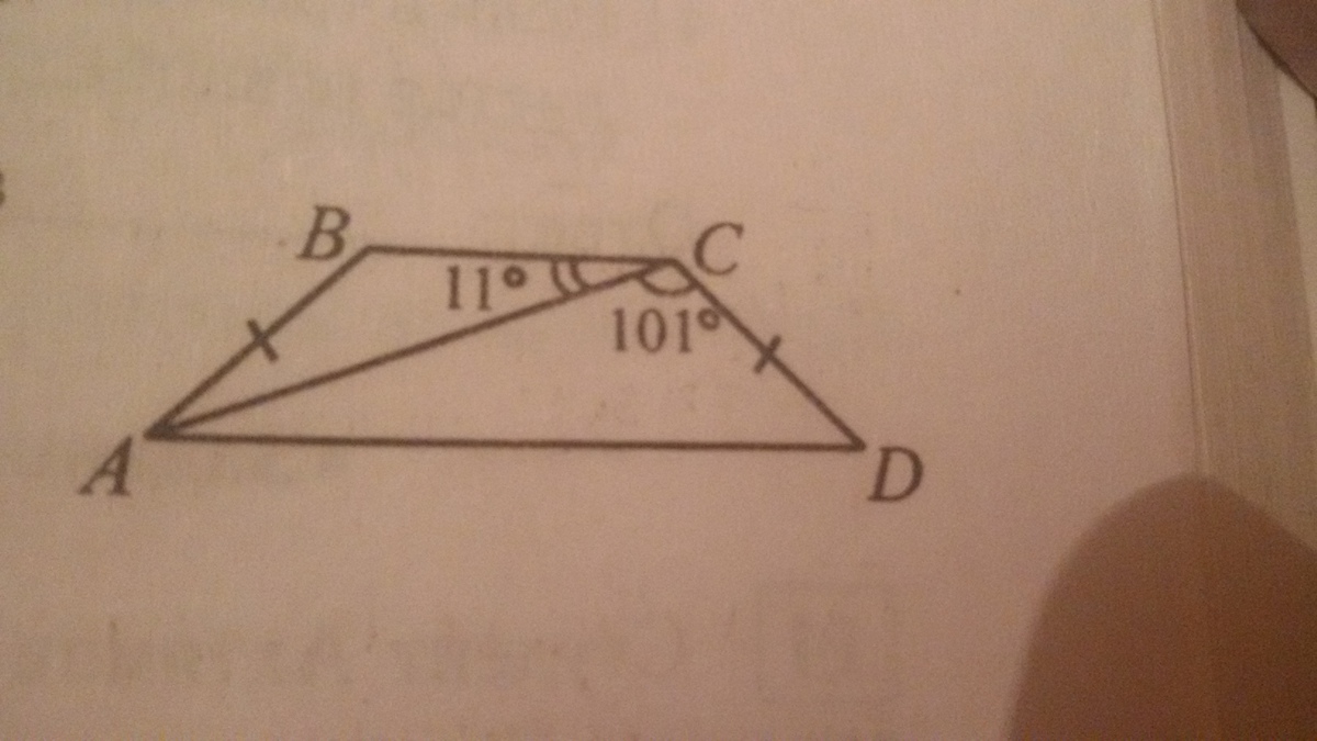 Найдите градусную меру меньшего из углов равнобедренной трапеции ABCD,если диогональ AC образует с основанием BC и боковой стороной CD углы,равные 11° и 101° соответственно.