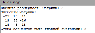 Цель работы: изучение методов разработки алгоритмов обработки многомерных массивов данных и их запись в виде блок-схем. Задание: Найти сумму элементов квадратной матрицы А[m, m], расположенных выше главной диагонали. Число m вводятся с клавиатуры, а элементы матрицы заполнить случайным образом целыми числами из диапазона [-30; 40].
