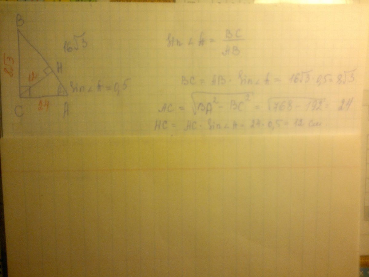 2) В треугольнике АВС угол С равен 90 градусов, АВ = 16√3, sin a = 0,5. Найдите СН.