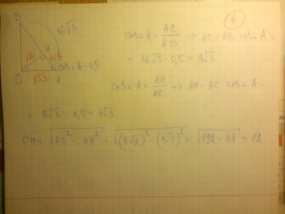 4)В треугольнике АВС угол С равен 90 градусов, АВ = 16√3, cos a = 0,5. Найдите СН.