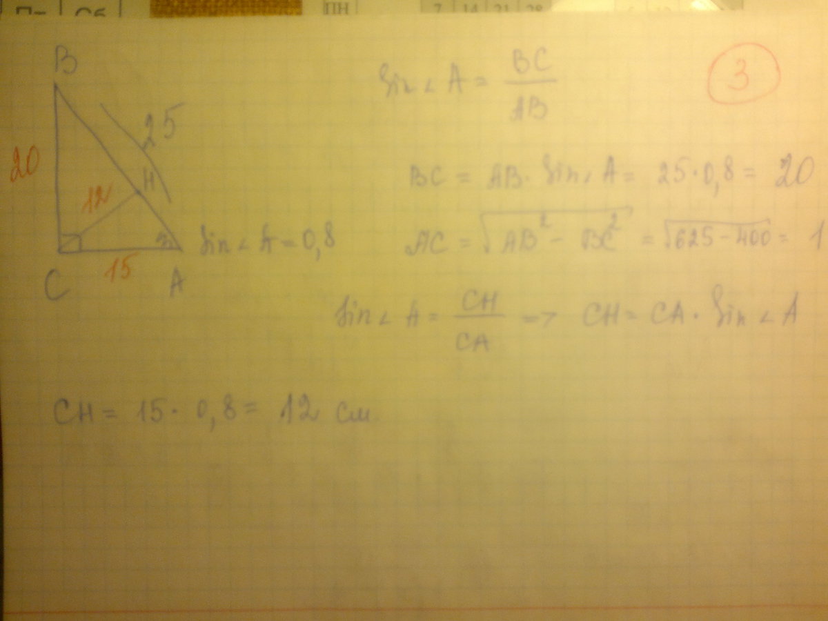 3) В треугольнике АВС угол С равен 90 градусов, АВ = 25, sin a = 0,8. Найдите СН.
