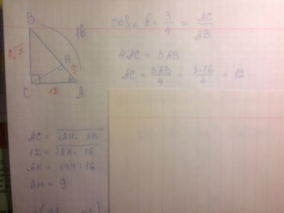 1) В треугольнике АВС угол С равен 90 градусов, СН - высота, АВ = 16, cos a = 3/4. Найдите АН.