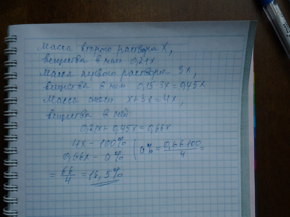 Смешивают два раствора одного и того же вещества различной концентрации. Первый раствор имеет концентрацию 15%. Второй раствор имеет концентрацию 21%, а его масса в 3 раза меньше , чем первого . Определите концентрацию раствора , полученного при смешивании