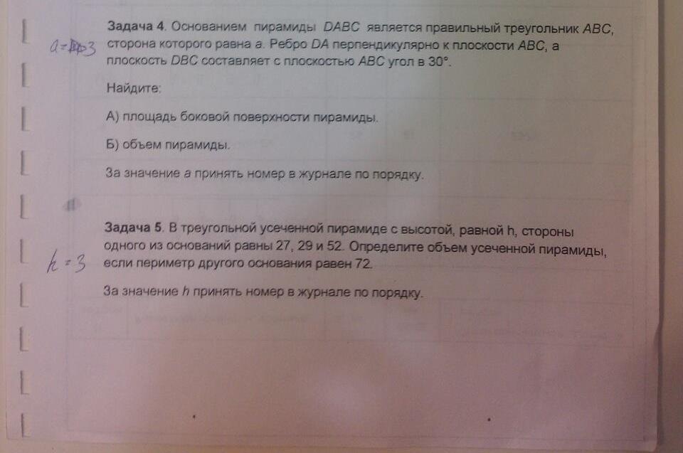 5. AB =27 ; BC =29 ;CA =52 ; P₁ =(A₁B₁+B₁C₁+ C₁A₁)=72 ;h =3.