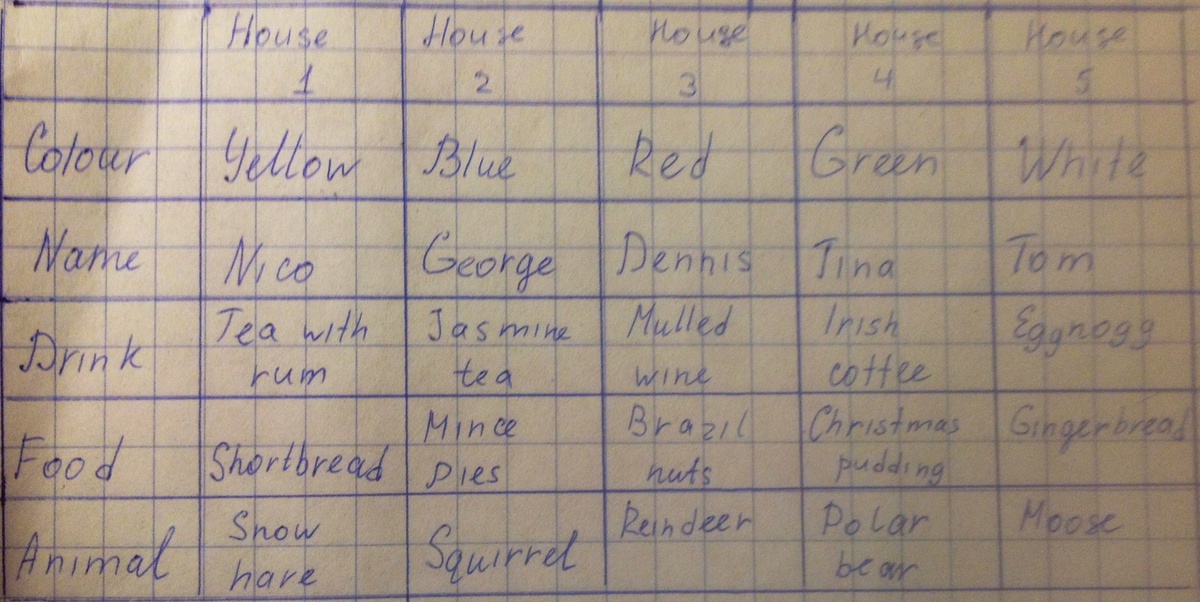 House 1: colour - yellow, name - Nico, drink - tea with rum, food - shortbread, animal - snow hare. House 2: colour - blue, name - George, drink - jasmine tea, food - mince pies, animal - squirrel. House 3: colour - red, name - Dennis, drink - mulled wine, food - Brazil nuts, animal - reindeer. House 4: colour - green, name - Tina, drink - Irish coffee, food - Christmas pudding, animal - polar bear. House 5: colour - white, name - Tom, drink - eggnogg, food - gingerbread, animal - moose.