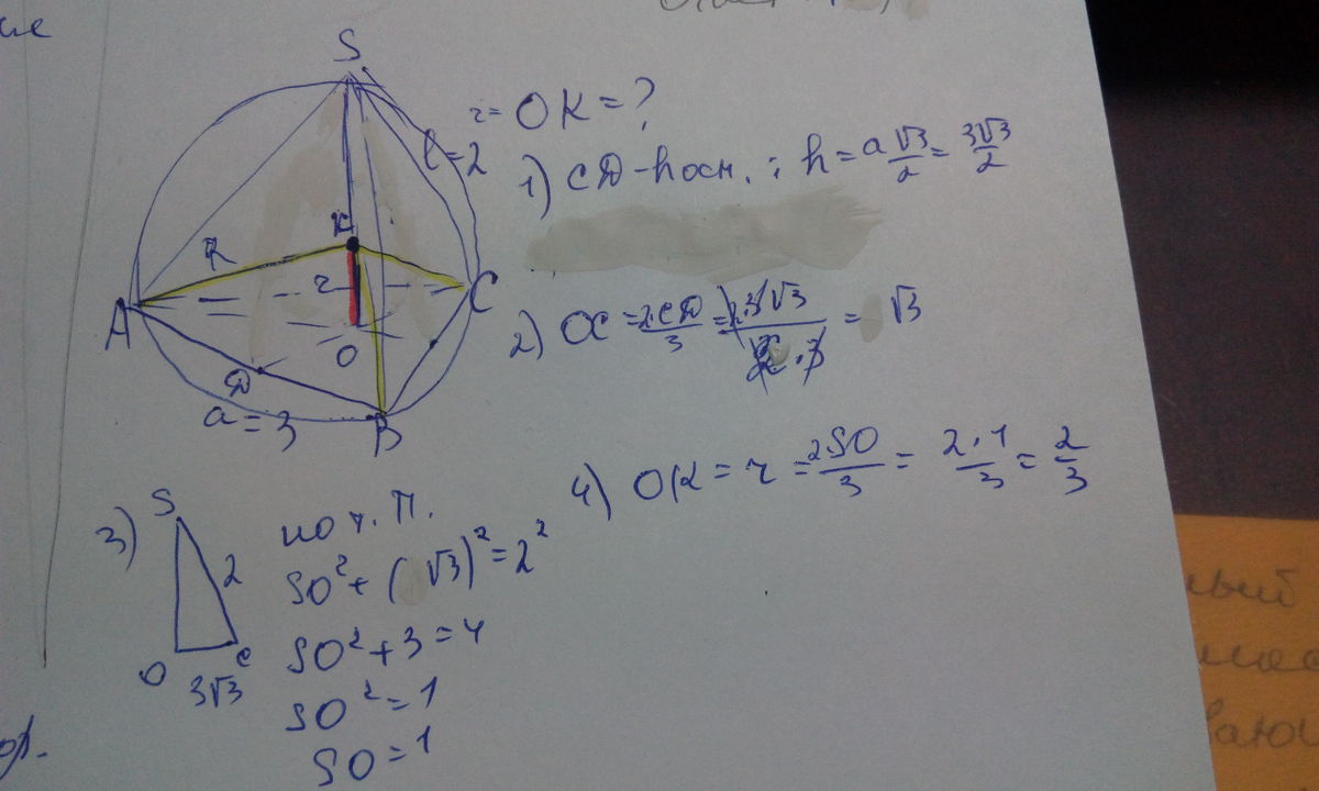 в правильной треугольной пирамиде стороны основания равны 3, а боковые ребра 2. около пирамиды описана сфера. Найдите расстояние от центра сферы до плоскости основания