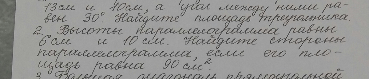Площадь параллелограмма равна произведению основания и высоты. Чтобы найти основание, нужно площадь разделить на соответствующую высоту. 90/10=9 см, 90/6=15 см.