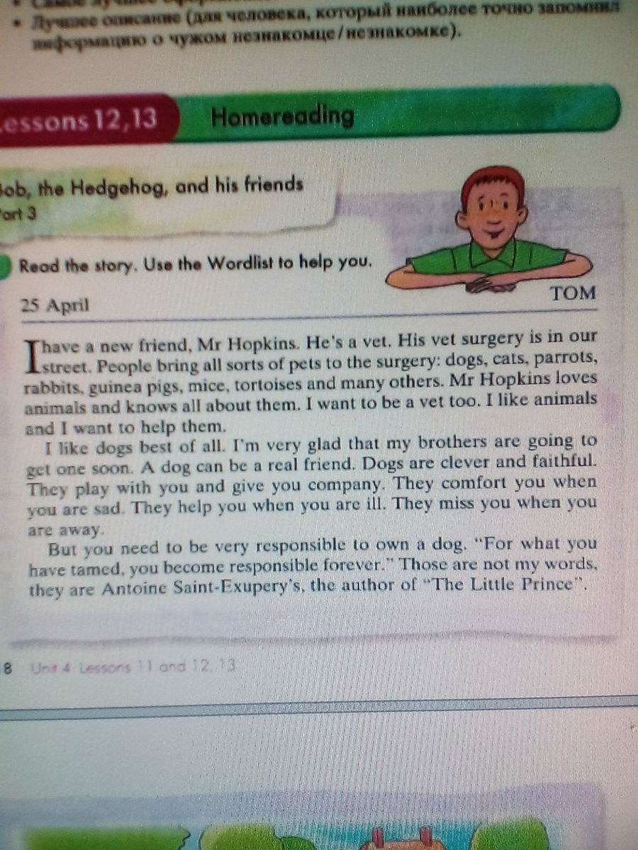 У меня появился новый друг мистер Хопкинс. Он - ветеринар. Его ветлечебница находится на нашей улицу. Люди приносят разных животных в лечебницу: собак, кошек, попугаев, кроликов, морских свинок, мышей, черепах и многих других. Мистер Хопкинс любит животных и знает про них все. Я тоже хочу быть ветеринаром. Я люблю животных и хочу им помогать.
