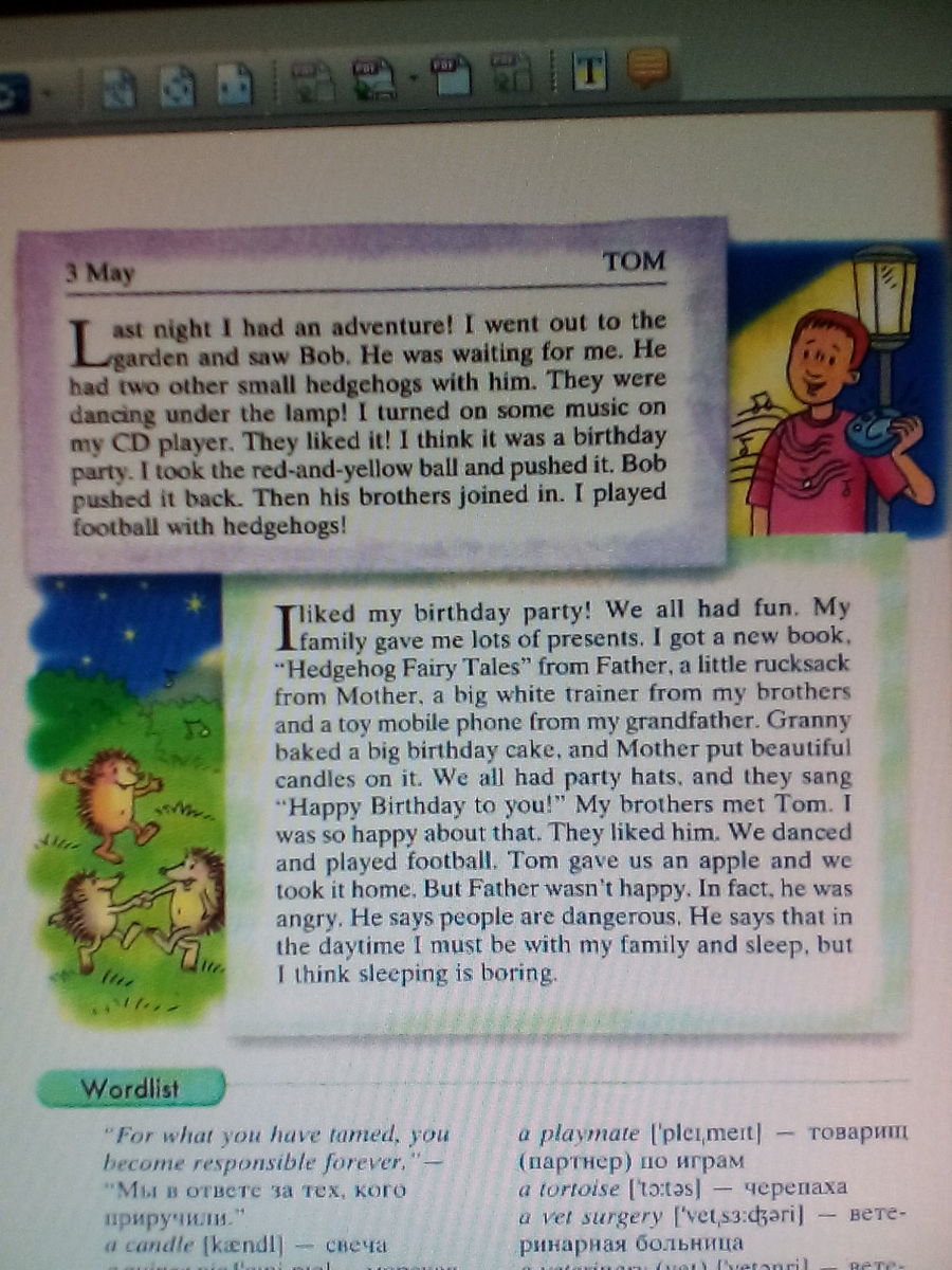 Мне понравился мой День Рождения! Нас было весело. Моя семья подарила мне много подарков. Я получил книгу "Ежиные сказки" от отца, маленький рюкзак от мамы, большой белый тренажер от братьев и игрушечный мобильник от дедушки. Бабушка испекла большой праздничный торт, и мама вставила в него свечки. У нас всех были праздничные шляпы, и они спели "С Днем Рожденья тебя!". Мои братья познакомились с Томом. Я очень этому рад. Он им понравился. Мы танцевали и играли в футбол. Том дал нам яблоко и мы забрали его домой. Но отец был не рад. На самом деле, он был зол. Он говорит, что люди опасны. Он говорит, что днем я должен быть дома с семьей и спать, но я думаю, что спать - это скучно.