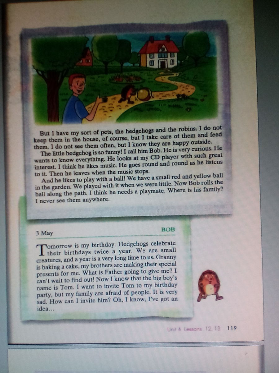 Прошлой ночью у меня было приключение! Я пошел в сад и увидел Боба. Он меня ждал. С ним было два маленьких ежика. Они танцевали под лампой! Я включил музыку на своем CD-проигрывателе. Им понравилось! Я взял красный и желтый мяч и толкнул его. Боб толкнул мне его назад. Потом его братья присоединились. Я играл футбол с ежами!