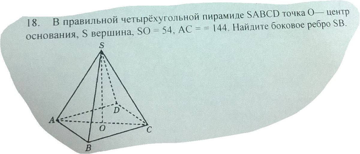 В правильной четырёхугольной пирамиде SADCD точка О -центр основания,S - вершина, SO =54, AC=144 . Найдите боковое ребро SB.