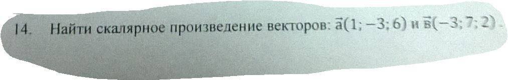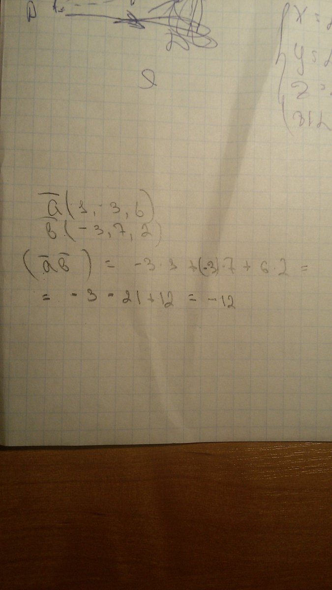скалярное произведение векторов a(x, y,z) и b (x, y ,z) = ax*bx+ay*by+az*bz= 1*(-3)+(-3)*7+6*2=-3-21+12=-12