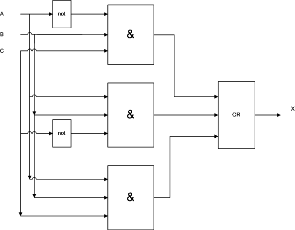 x:= (not(a) and b and c ) or (a and b and not(c) )or (a and b and c );