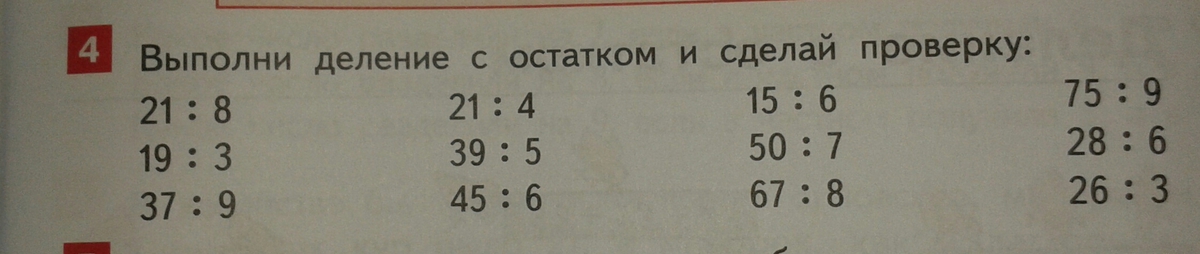21 :4= 5 (ост .1) пр. 4*5+ 1 = 21