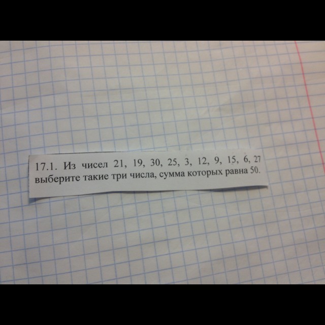 Задание:Из чисел 19, 21, 30,25, 3, 12, 9 15, 6 , 27, выберите такие три числа, сумма которых равна 50.
