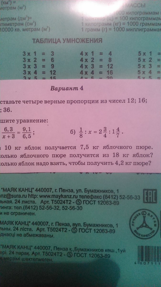 1) Составте четыре верные пропорции из чисел 12; 16; 27; 36. 2) Решите уравнение: а) 6,3:(х+3)=9,1:6,5 б) 1/8:х=2 3/4:1 4/7 . 3) Из 10 кг яблок получается 7,5 кг яблочного пюре. Сколько яблочного пюре получится из 18 кг яблок? Сколько яблок надо взять, чтобы получить 4,2 кг пюре?