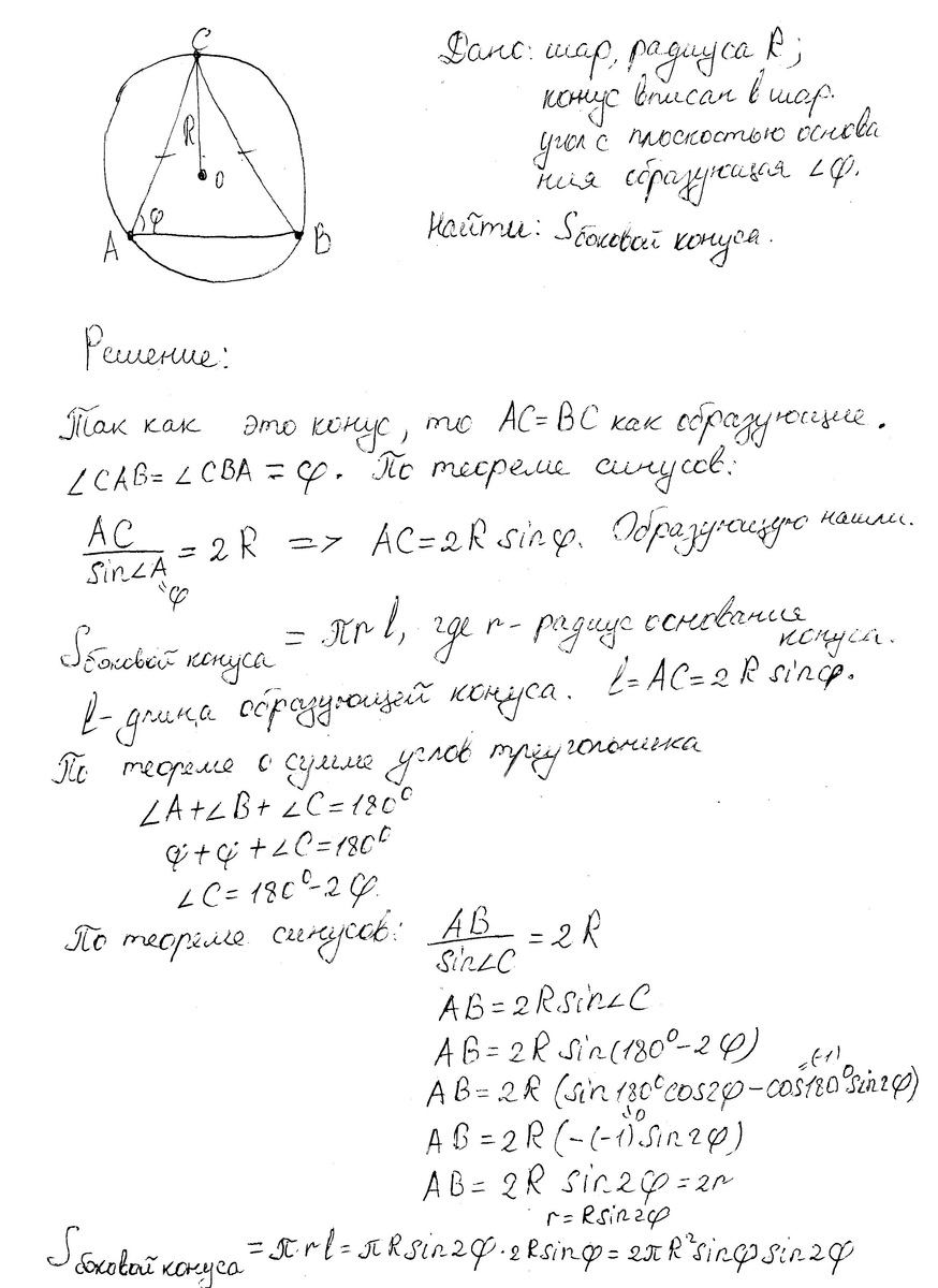 в шар радиуса R вписан конум у которого образующая составляет плоскостью основания угол ф 1) найдите площадь боковой поверхности конуса