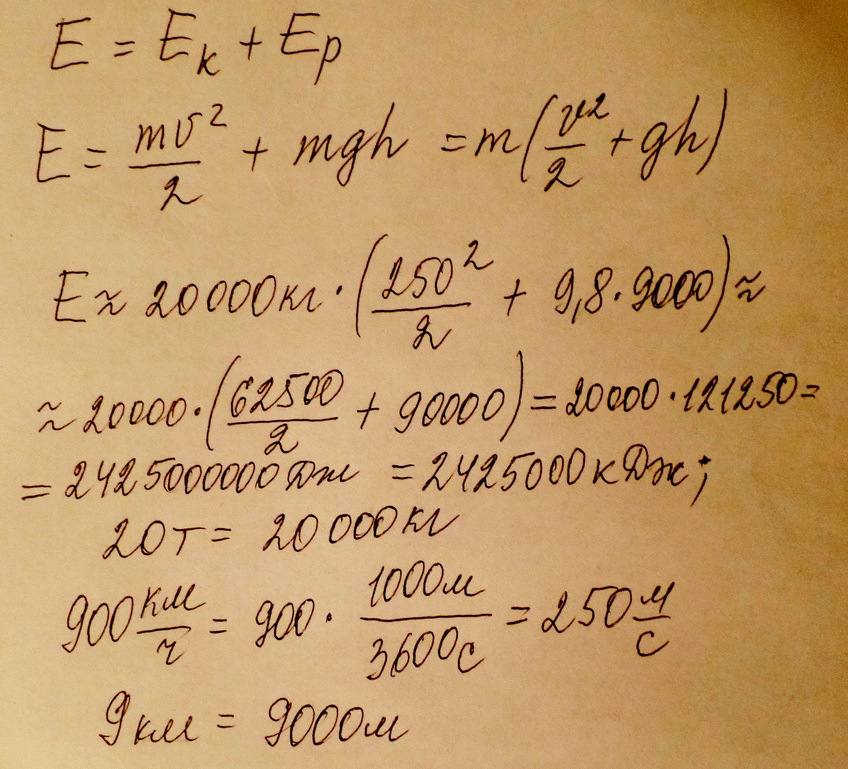 самолет летит со скоростью 900 км/ч на высоте 9 км от земли. Какова полная механическая энергия самолета массой 20т
