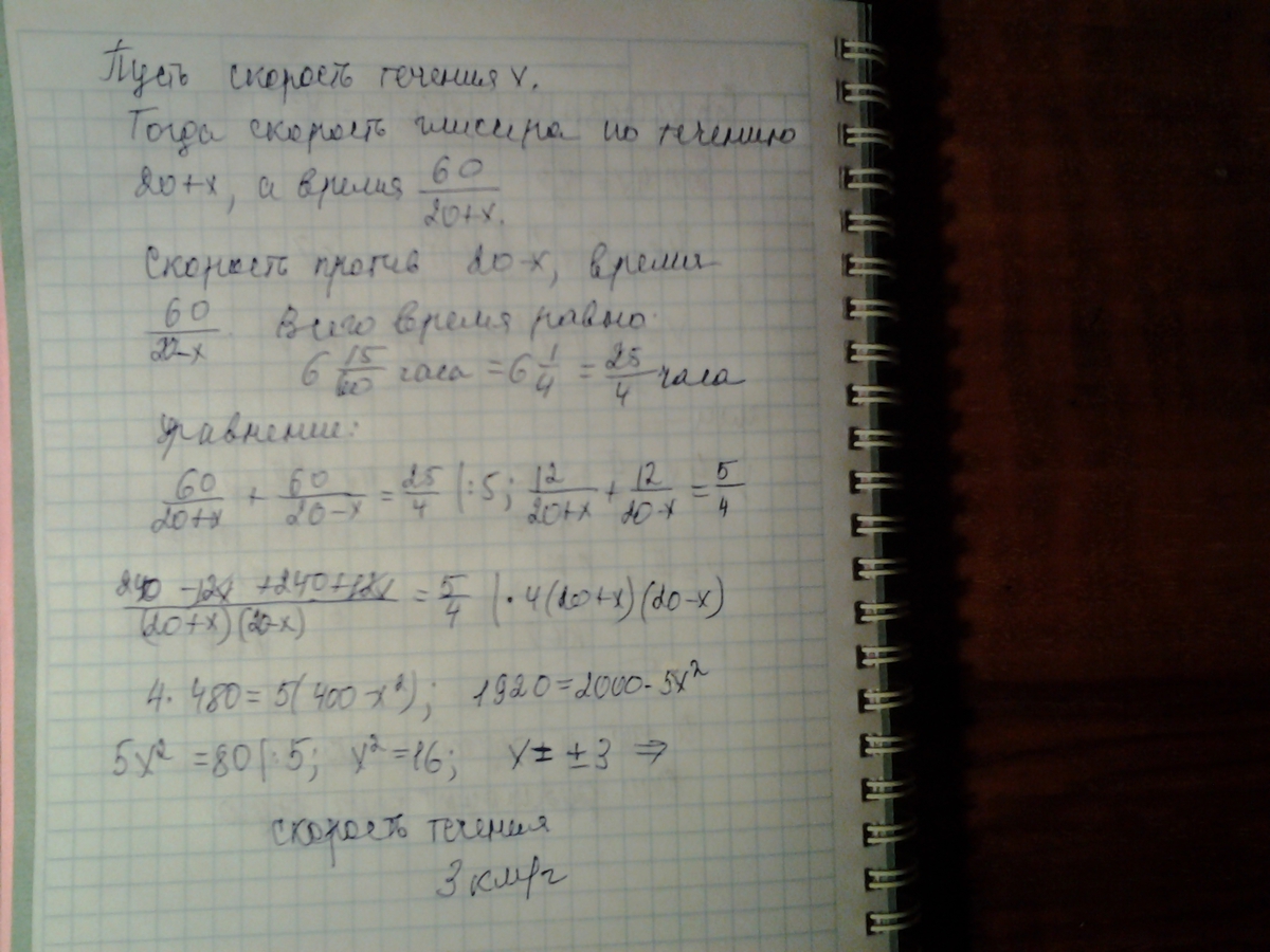 Глиссер, собственная скорость которого равна 20 км/ч, прошел по реке расстояние равное 60 км и вернулся обратно. Найдите скорость течения реки, если на весь путь глиссер затратил 6 ч 15 минут