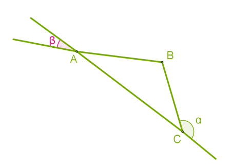 Так как расстояния ВА и ВС одинаковы, следовательно, треугольник равнобедренный. Углы α - внешний угол треугольника и в сумме с внутренним углом C, смежным с ним, составляет 180°. Следовательно, <C = 180°-152°=28°.