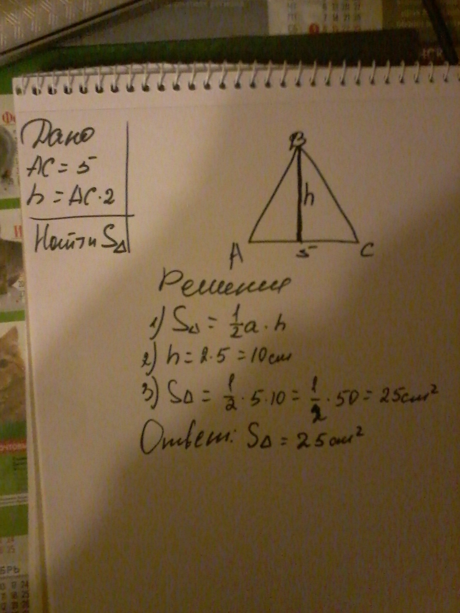 S= ¹/₂ ah=¹/₂ *5 *10 = 25 (см²) - площадь треугольника