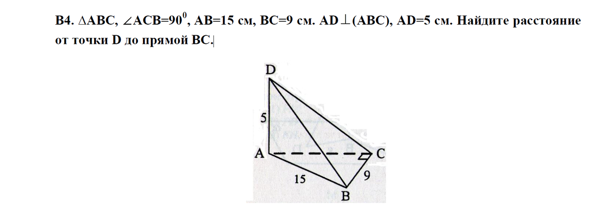 ΔАВС, ∠АСВ=90, АВ=15 см, ВС=9 см. AD⊥(АВС), AD=5 см. Найдите расстояние