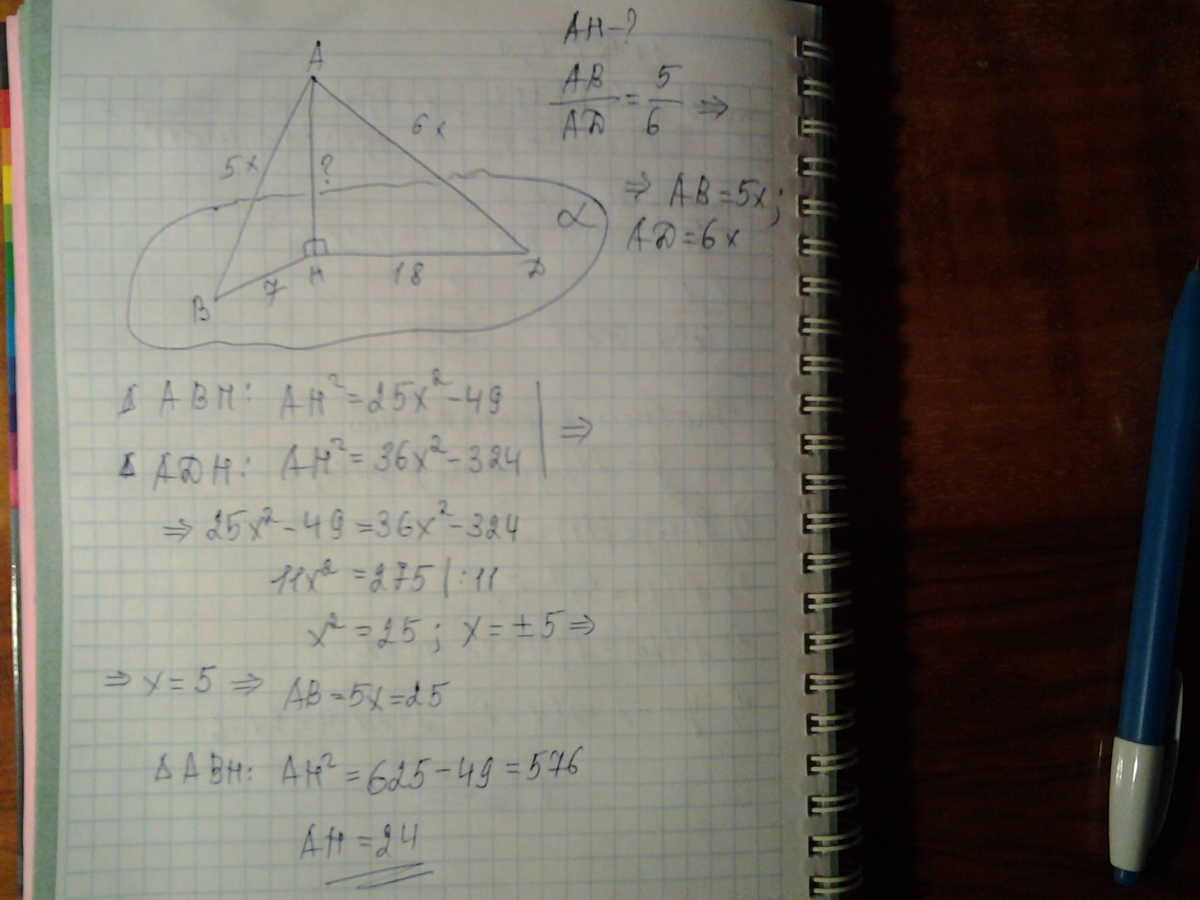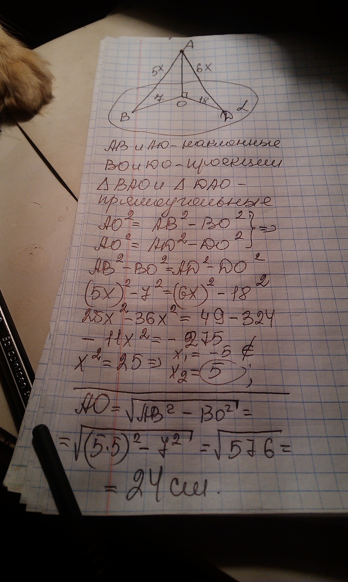 Из точки А к плоскости α проведены две наклонные - AB i AD. Проекции этих наклонных на плоскость α равны 7 см и 18 см соответственно. Найдите расстояние от точки А до плоскости α, если АВ: АD = 5:6.