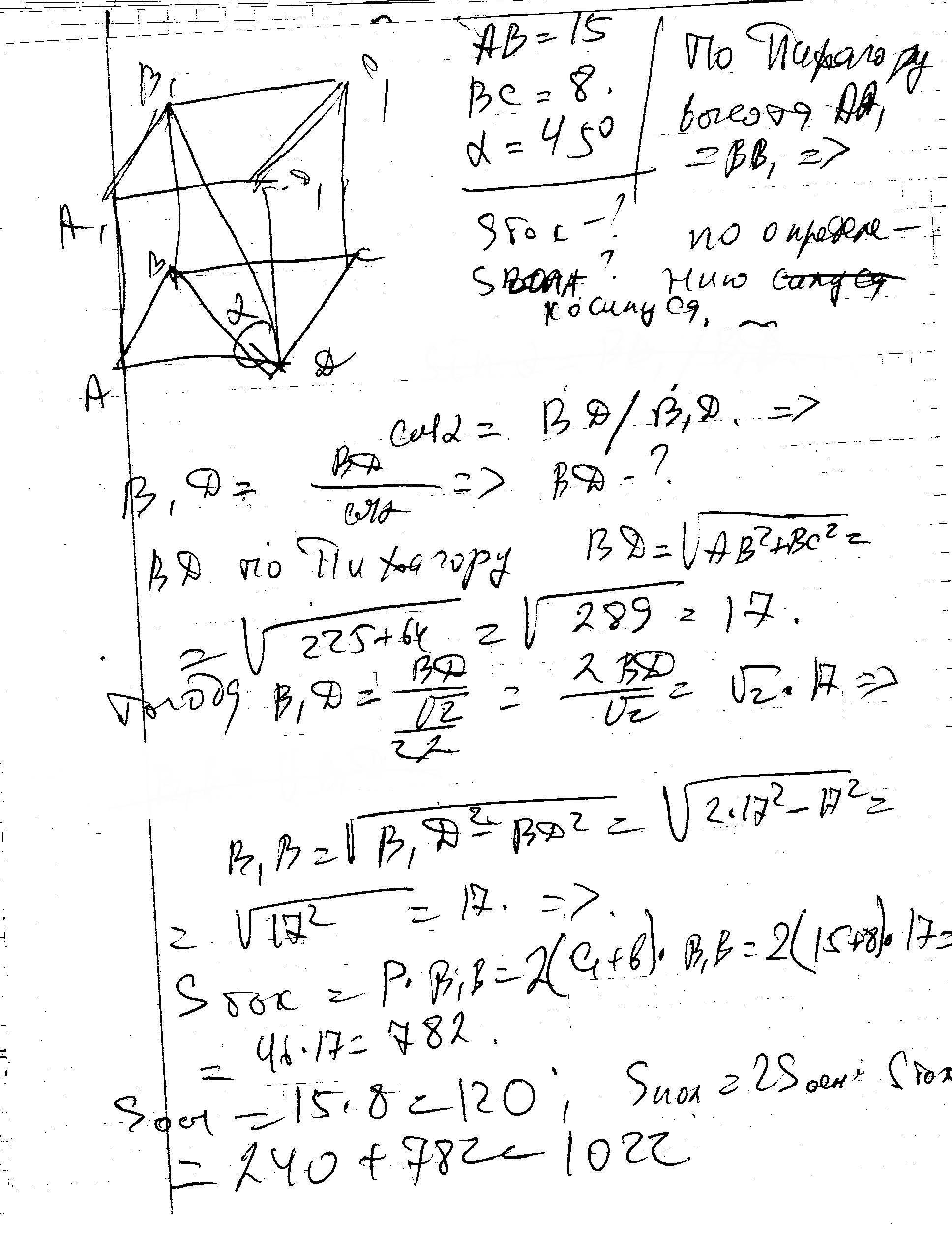 В прямоугольном параллелепипеде стороны основания равны 15 см и 8 см. Диагональ параллелепипеда образует с плоскостью основания угол 45°. Найдите площадь боковой и полной поверхности.